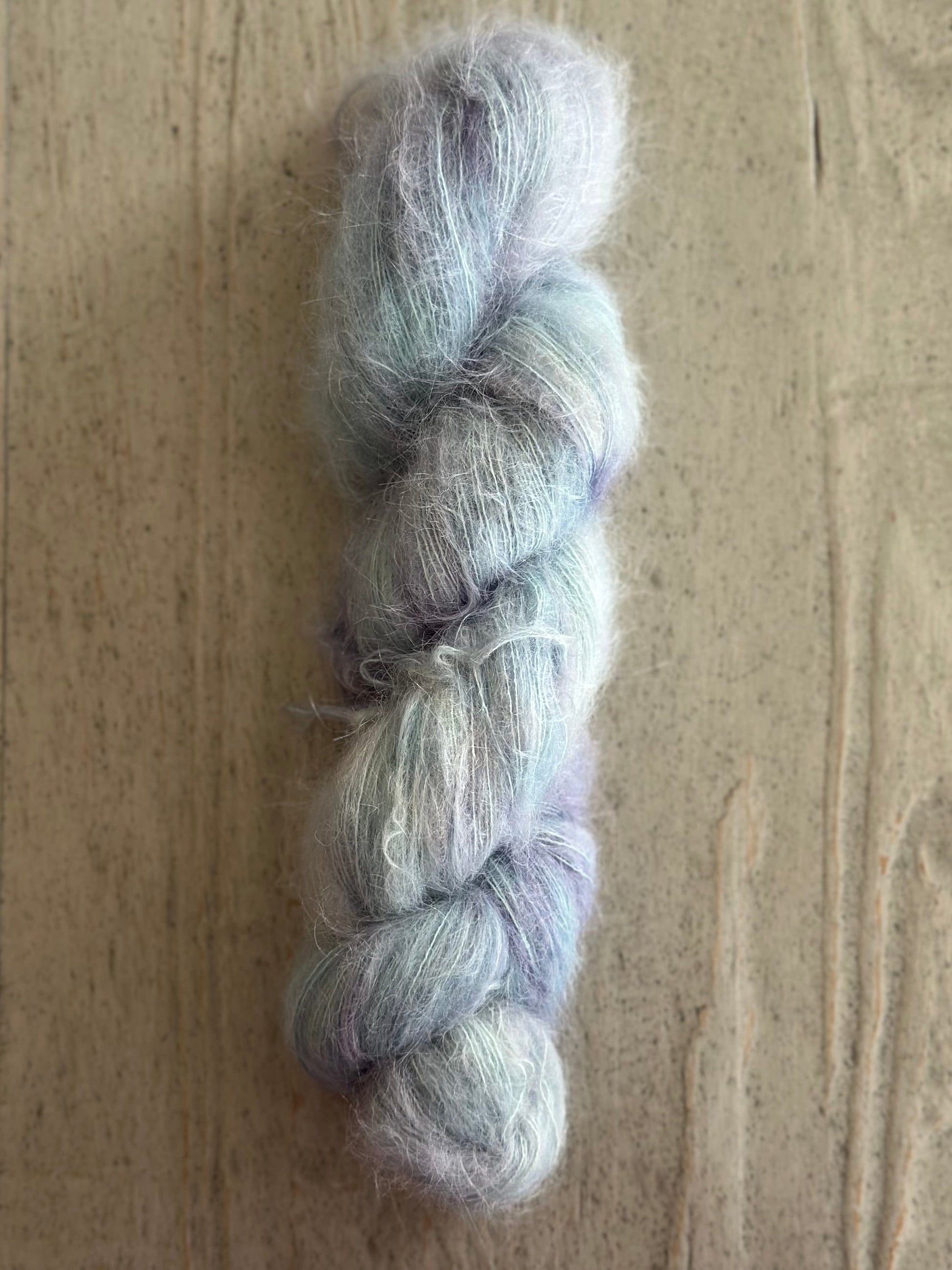It shines on its own in gauzy lacework, or doubled up with a tonal companion for plush sweaters and cozy shawls. The fabric blooms softly, creating a whisper of fuzz with elegant drape — perfect for layering warmth without bulk.